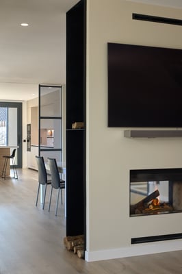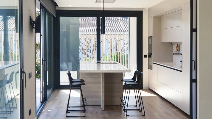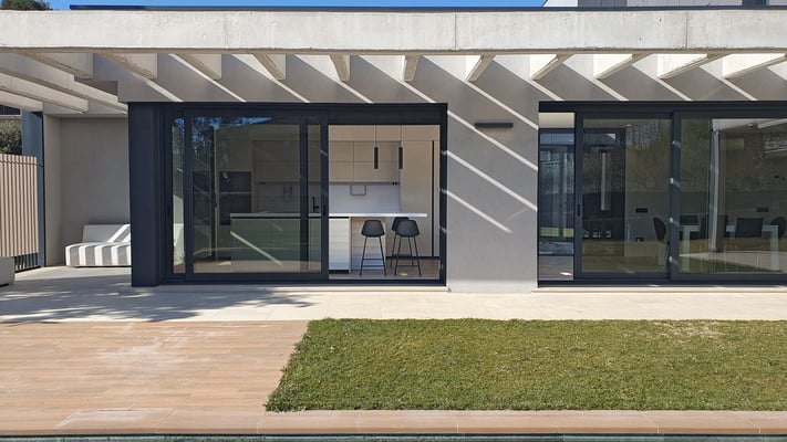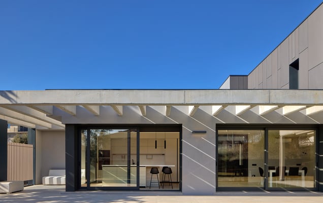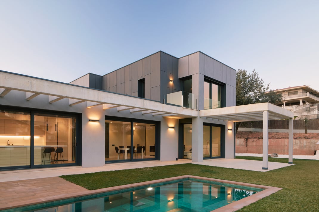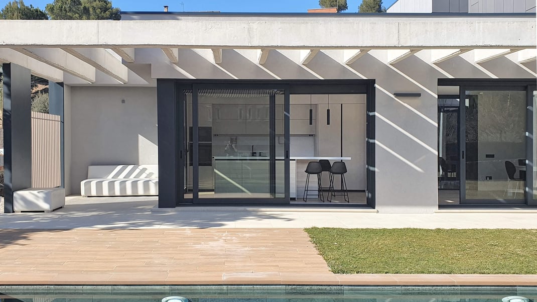 L'estructura de la casa es compon de formigó armat i l'estructura creua la façana i es converteix una gran pèrgola de 15 metres de llarg sense pilars, amb revestiments exteriors de façana ventilada d'Equitone. Els acabats interiors són de gran qualitat, amb predomini de materials naturals i colors neutres, que creen una estètica minimalista i sòbria.